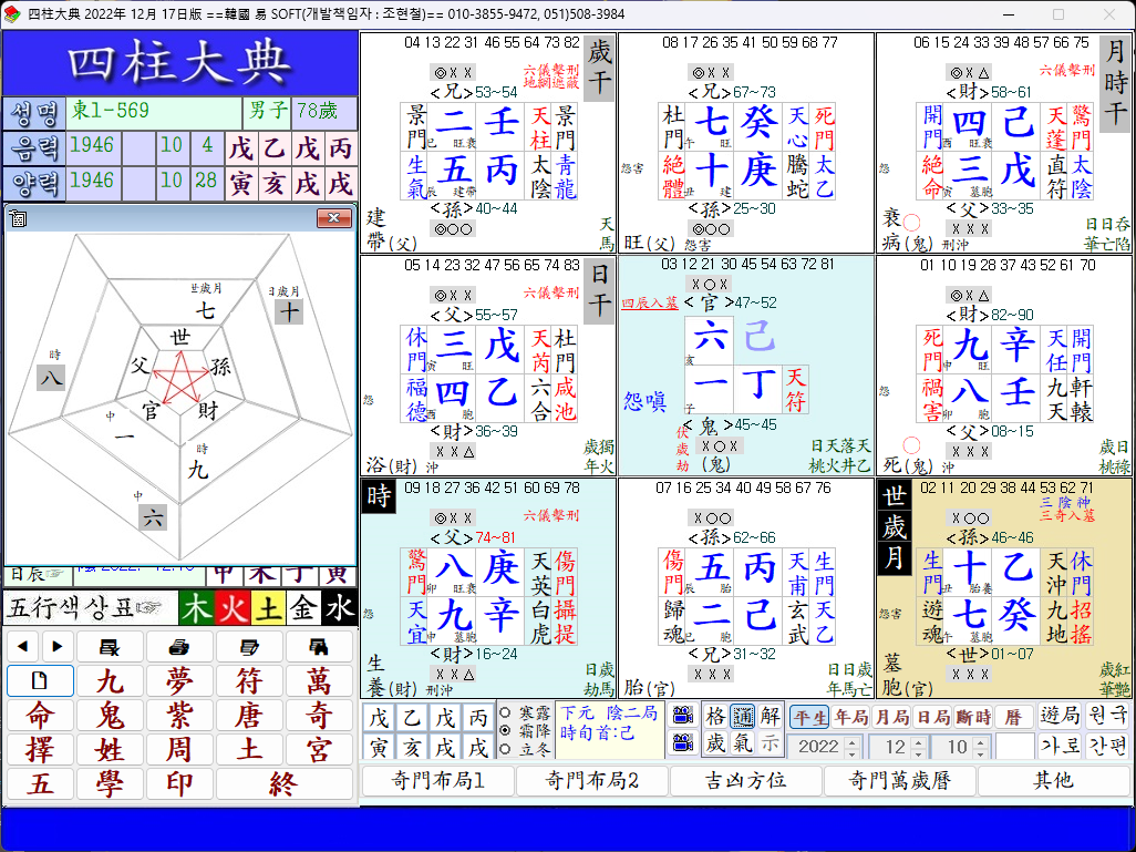 遊年 二十五歲에서 三十歲까지가 離上의 傷官運에서 杜門 切體를 만나고 十土傷官이 時上九金財星을 助하므로 時財가 中鬼를 生해 凶厄이 發하고 日干이 落在 震宮인데 天盤六戊는 六儀擊刑이 되고 天芮와 休門 또한 休亡으로서 短壽의 徵候다.(오토바이 事故)