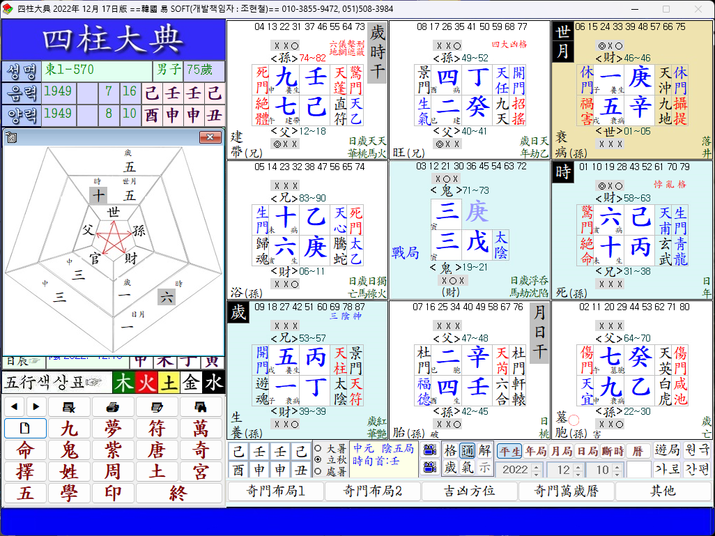 遊年은 二十二歲에서 三十歲까지 空亡의 乾上 孫運이 와서 日支 五土와 乾上 九七과 三殺이 會動하여 白虎를 逢하고 癸丑 小運은 坎上 日干宮에 떨어져 天芮를 보니 橫厄을 못 免할 相이다.