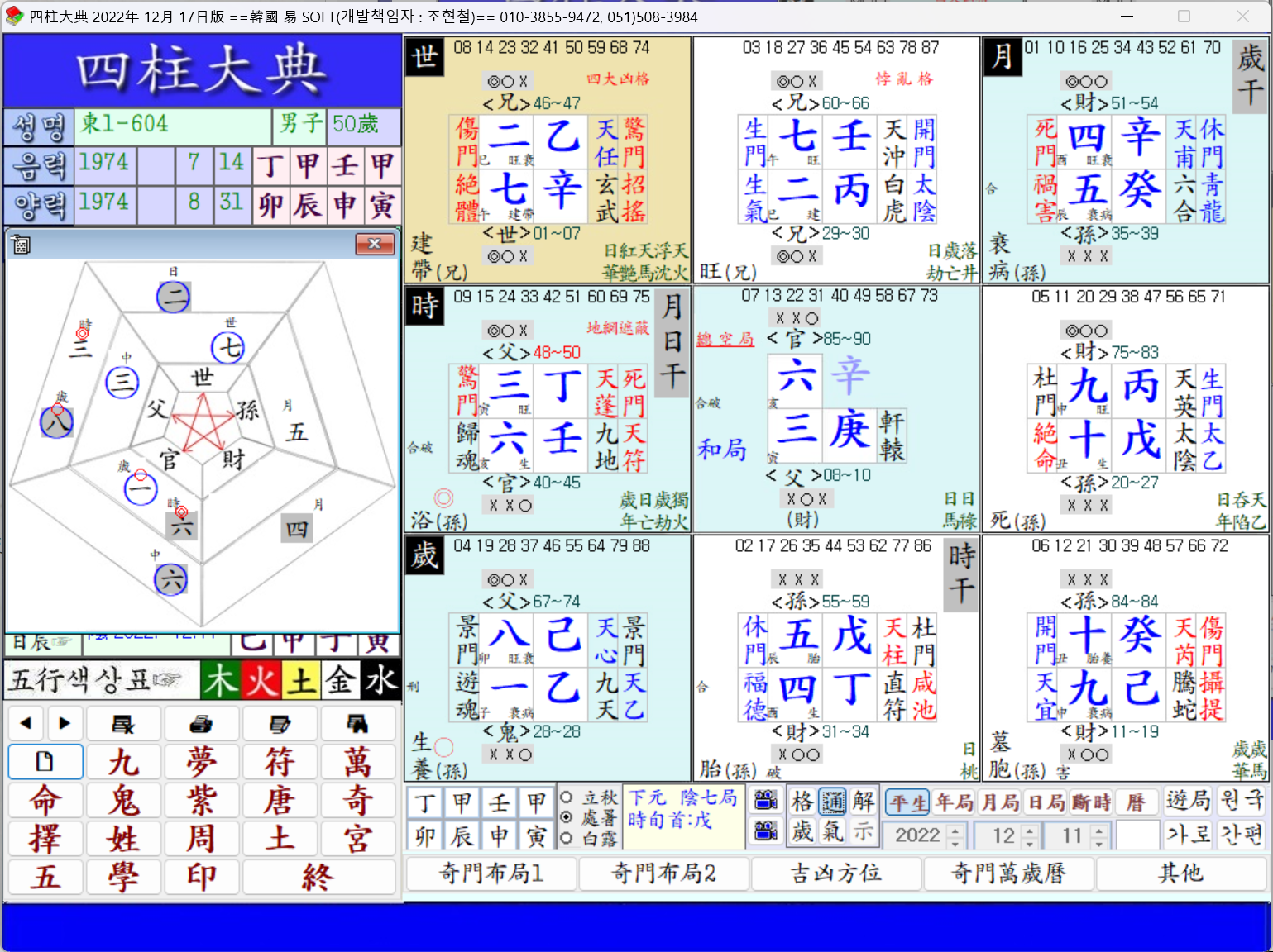 解斷 日支가 傷門絶體에 靑龍逃走를 보고 天馬를 乘하니 凶兆가 宛然한데 日干이 時上에서 落空하여 驚門歸魂이요 歲支의 偏官이 스스로 一八相刑한채 月支를 沖剋하여 다시 空亡을 보며 月支 또한 死門 禍害에 天甫六合이나 兩神이 皆木인데 星剋宮은 迫이 되므로 吉星門이 宮을 剋함은 凶星門이 宮을 生함만 못한 고로 吉은 不發이요 天地干儀가 또한 凶이라 慘禍를 입음도 當然之事라 하겠다.