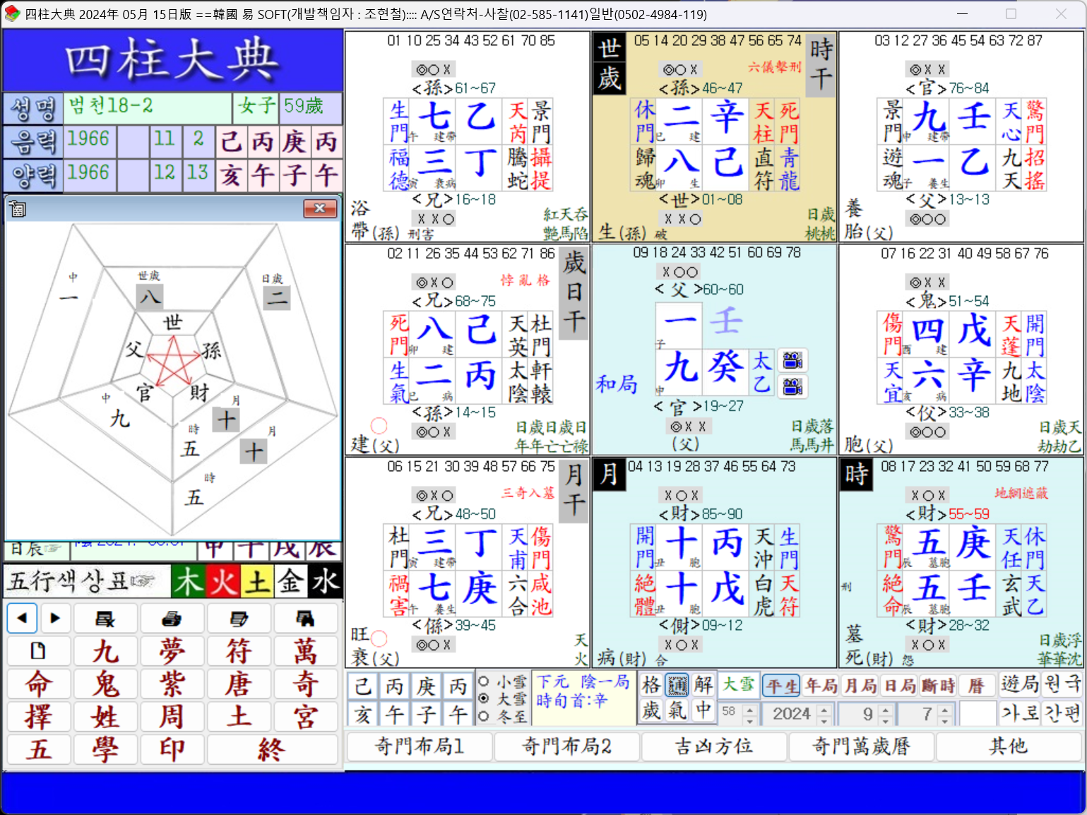 中宮 天盤의 一水를 生하는 것까지는 아까와 비슷한데 이번에는 遊年에서 天盤에 三木이 動하여 世(歲)를 生하러