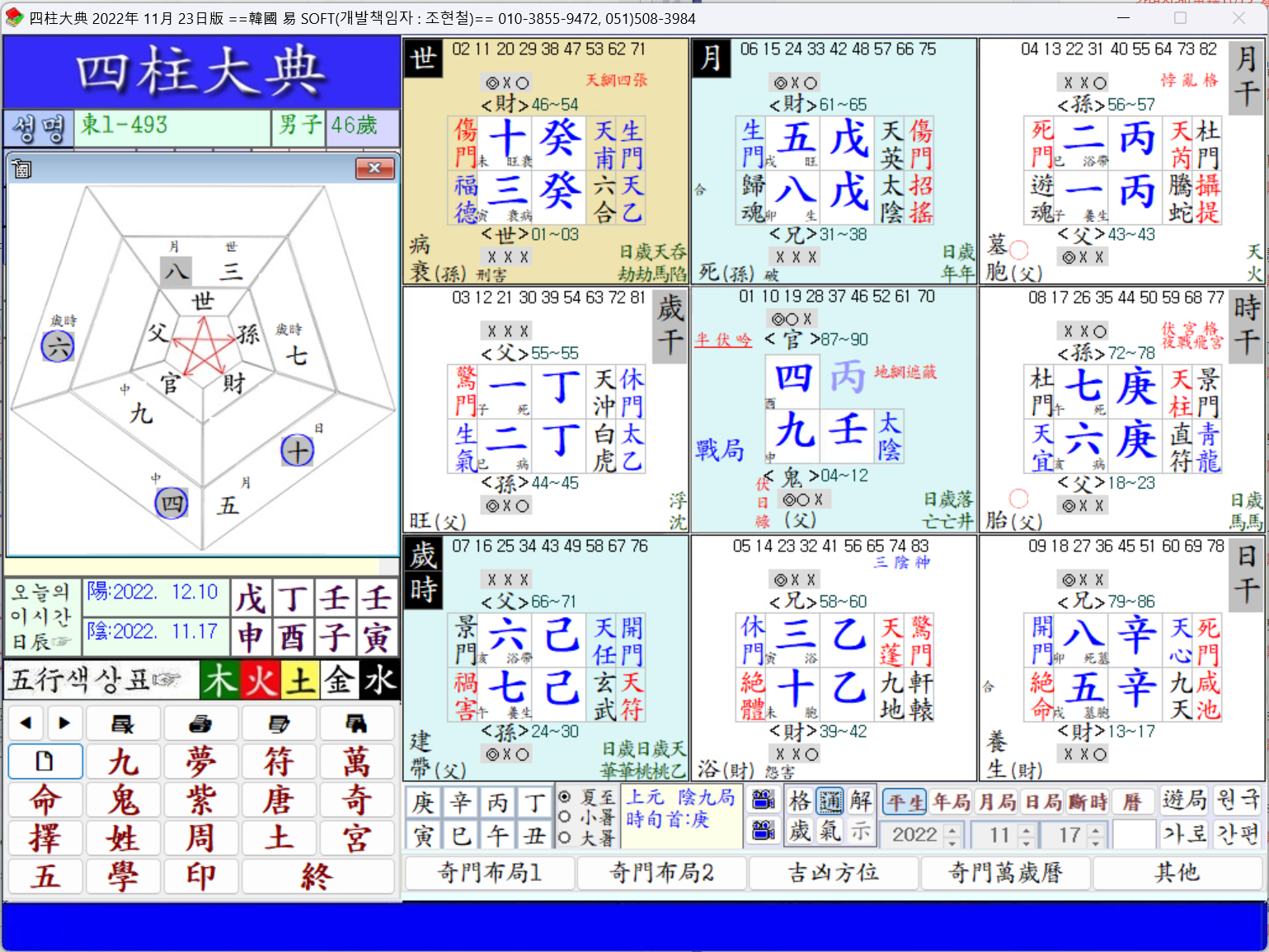 歲時에 景門을 만나고 月支에 生門을 그리고 日支에 福德을 만나서 四支와 俱逢吉門卦라 化殺을 作하고 歲支上에 食傷과 印星이 支木을 通해 共存하고 中宮에는 雙鬼라 學者로서의 要件을 갖추었다.