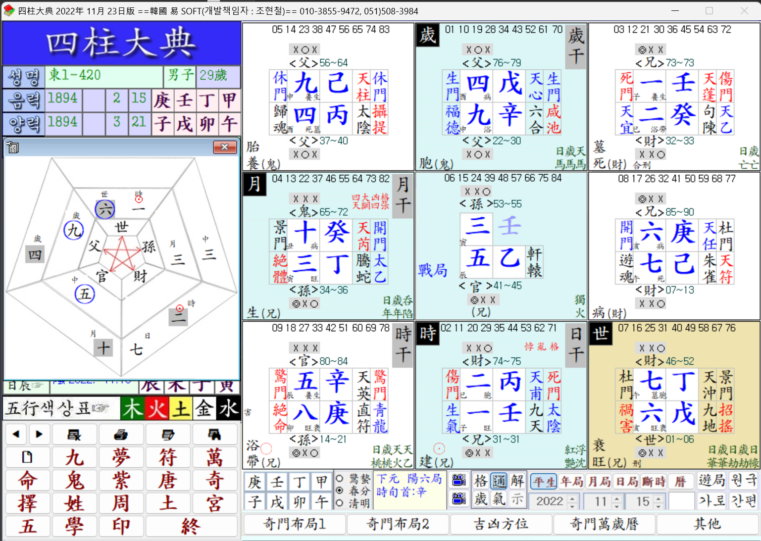 비록 戰局이지만 中生歲하고 歲生日하여 成局이 되고 日時가 함께 月孫을 生하나 마지막 月孫이 流通不能으로 中官과 부딪히므로 木土相戰이 되어 木旺土虛로 마지막에는 病魔에 꺾이고 말았다. 그의 遊年을 살펴보면 靑雲의 뜻을 實現시키고자 渡美留學의 길에 오른 것은 氏의 나이 二十一歲로 艮上의 食神方이었으나 二十二歲에서 三十歲까지의 離上 歲支宮이 九年正印運으로서 乘旺인데 生門福德이었으니 學業을 完遂할 수가 있었고 八一五 光復以後는 氏의 한동안 得意의 時代였으니 遊年 四十六歲에서 五十二歲 사이가 杜門遊魂의 日上 正財運이라 七火가 中五와 歲九의 사이에 징검다리가 되어 三殺을 作하였고 五十三歲以後 六十四歲 사이가 巽上九金이라 喜悲雙曲 끝에 끝내 病魔에 꺾기고 만 疾厄死喪의 運이였다.