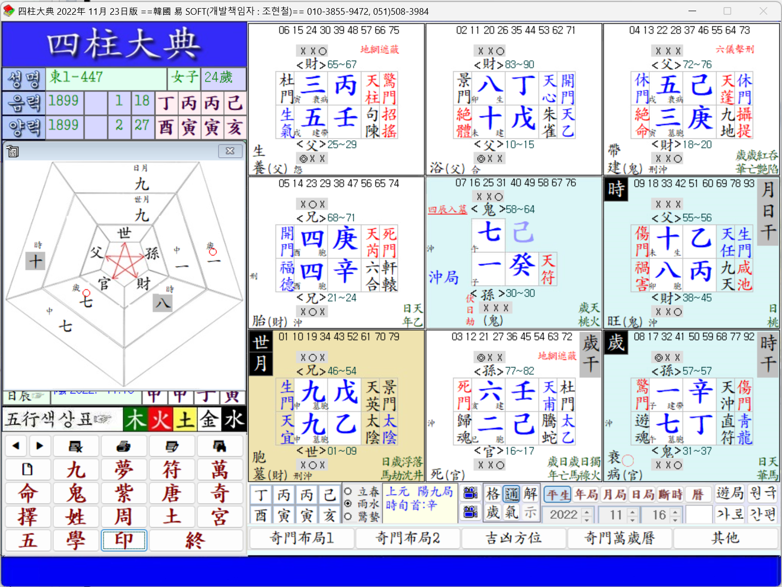 月日이 同宮하여 雙九를 作하고 生門天宜라 功名의 發遂요 歲上 偏官이 被沖剋인데 中孫이 更作 加沖하여 萬年 孤獨之相이다. 官孫이 皆作沖이니 家率이 緣薄함은 八字에 定한 바라 하겠다.