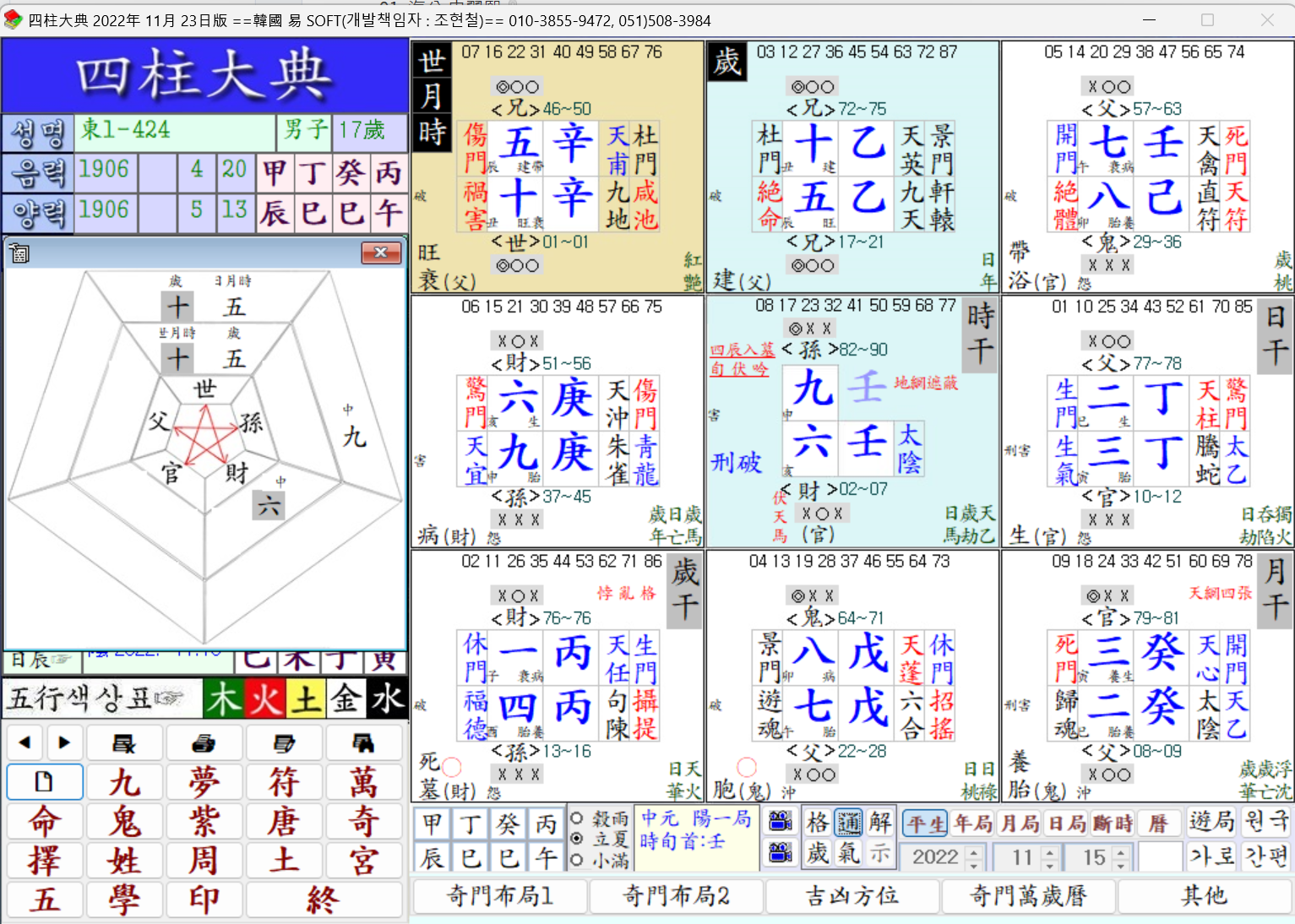 先生의 命局은 刑破局으로서 四支가 모두 雙土인데 得令에 居生하니 旺土가 印綬方에 앉았으므로 己身이 太旺하다 中宮의 六水財爻는 上數 食傷에 生助를 받으니 食神生財格인데 兌方의 日干己身이 丁奇로서 兼勢하니 丁酉貴人陞正殿格인데 生門生氣를 逢하니 日支와 더불어 日干도 亦旺吉하다.