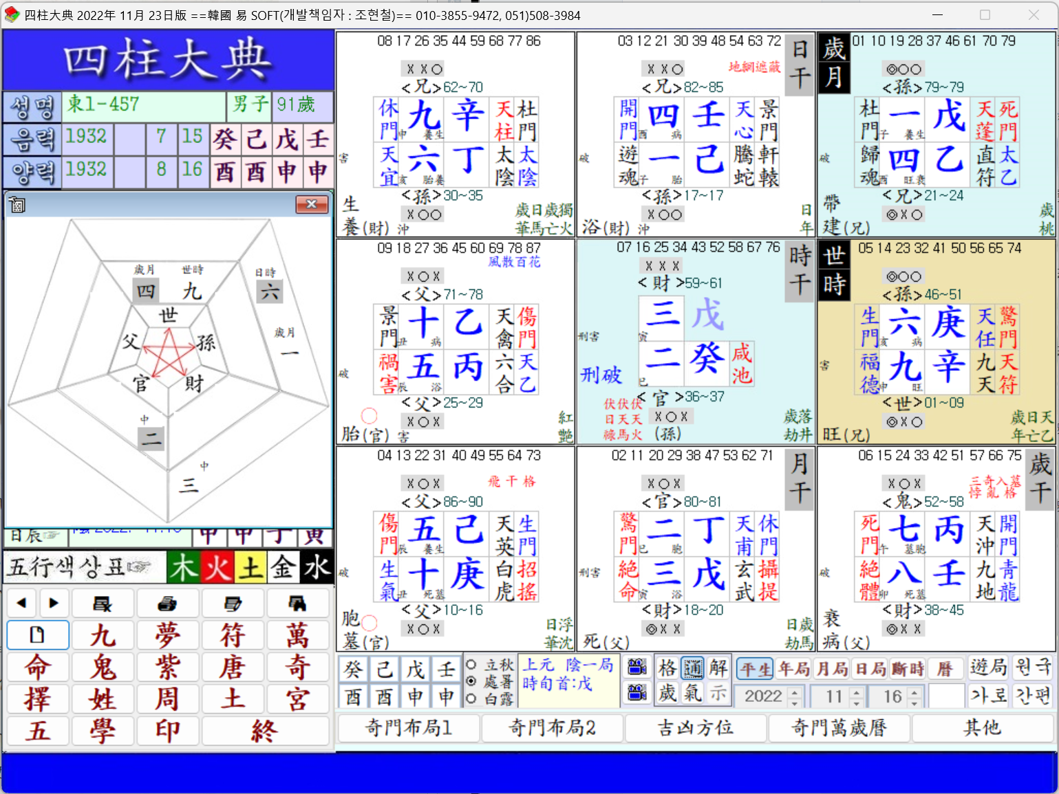 遊年은 五十二歲에서 五十八歲까지가 乾上偏官宮에 들어 地盤 正財가 財生官을 하지만 門卦가 皆凶하고 天地干儀가 丙加壬이라 이는 江輝相映이라 雖有大利나 是非頗多라 하므로 어쩌면 氏의 政治的 近況과 그다지도 恰似한지 모르겠다.