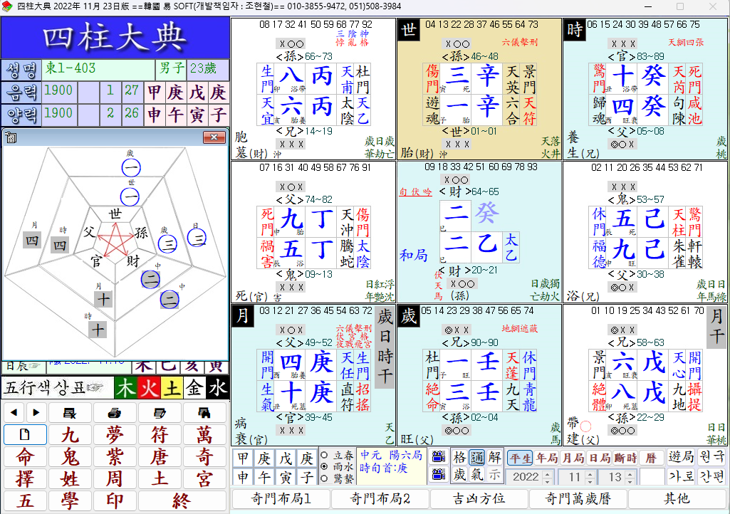 貴者는 用財로서 中宮의 雙財가 곧 用神이라 하겠고 中生月支하여 開門生氣의 偏官을 中宮의 雙財가 助하므로 失令失地의 官星이지만 有氣한 相이고 또 月官이 時支를 通하여 通氣를 形成하므로 己身 또한 有氣하다.