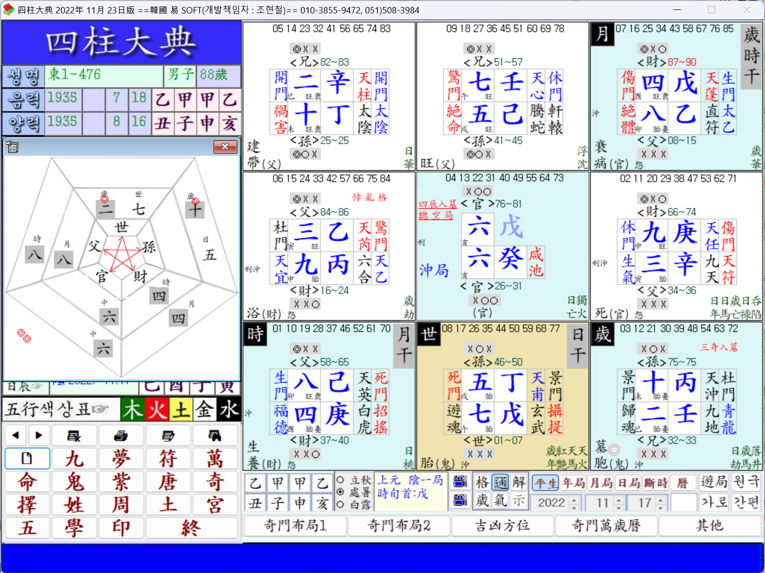 退하는 時期는 小遊年에 달렸는데 금년 丁卯年은 兌上에 떨어져 休門 生氣에 天任 九天이라 四神이 皆吉이지만 天地干儀가 鐵槌碎玉이라 凶하고 洪數上下는 印綬가 被沖인데 遊年大運의 七五와 小運의 九가 三殺을 作할뿐더러 歲支와 小運의 上下數는 三刑을 作하여 印綬를 刑剋하니 丁卯運勢는 官祿을 退하는 그 決定的 時機라 하겠다.