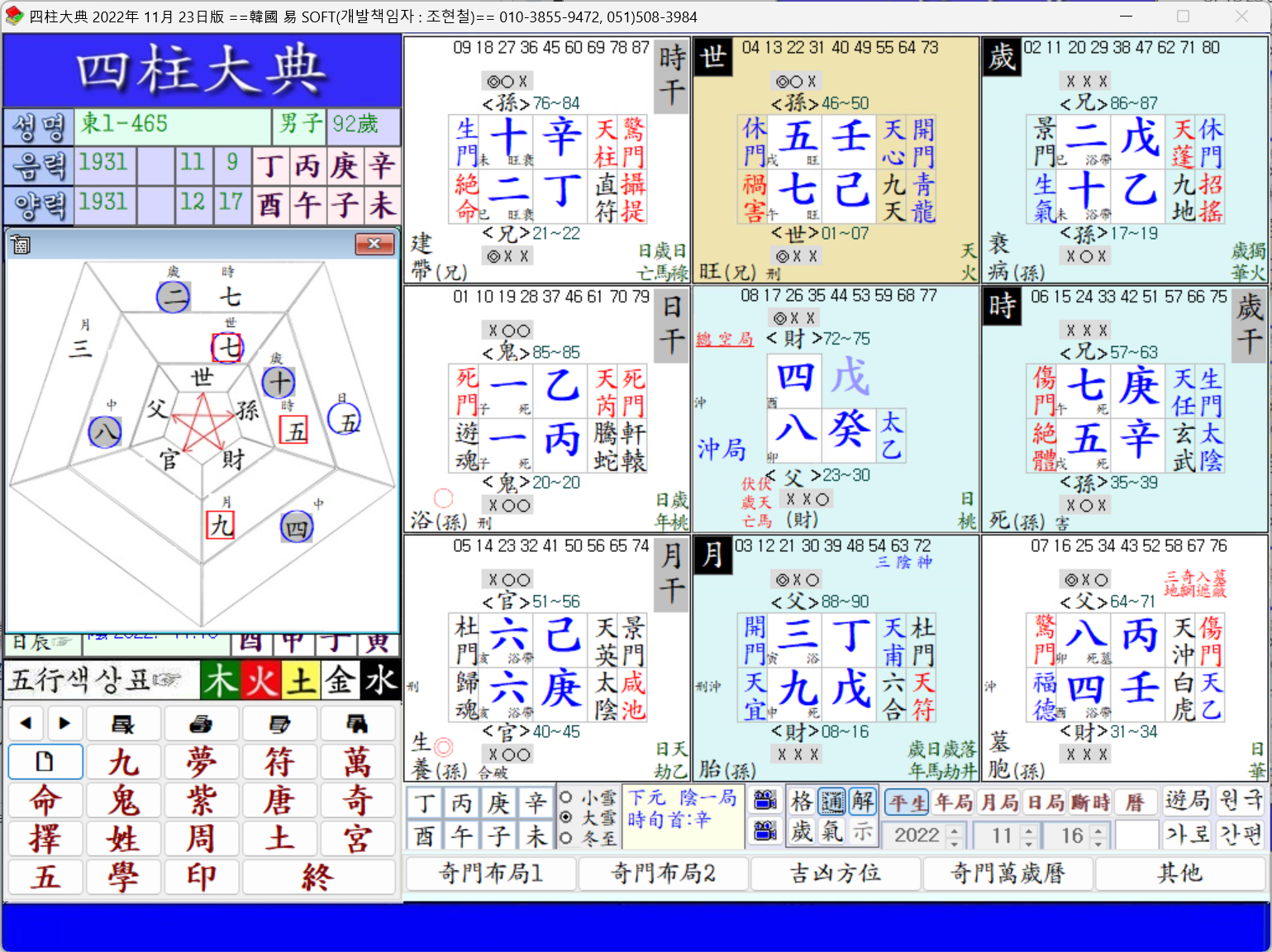 日支 七火가 月支 九金과 時支 五土가 三殺을 作하여 武將임을 나타내고 雙水가 官鬼로서 寅卯方에 앉고 中宮에 八木이 印綬로 앉았으므로 官印相生이 되고 있으며 官星이 月令에 旺氣를 타고 兼旺이라 旺한데 官星이 落在 空亡이나 歲支가 景門 生氣에 天地干儀가 戊加乙이니 靑龍合靈이라 하고 天蓬星을 만남에 武人의 職이 適格하고 歲孫이 月財를 通해 支地의 水官을 助하므로 官星은 더욱 旺하다.{466}