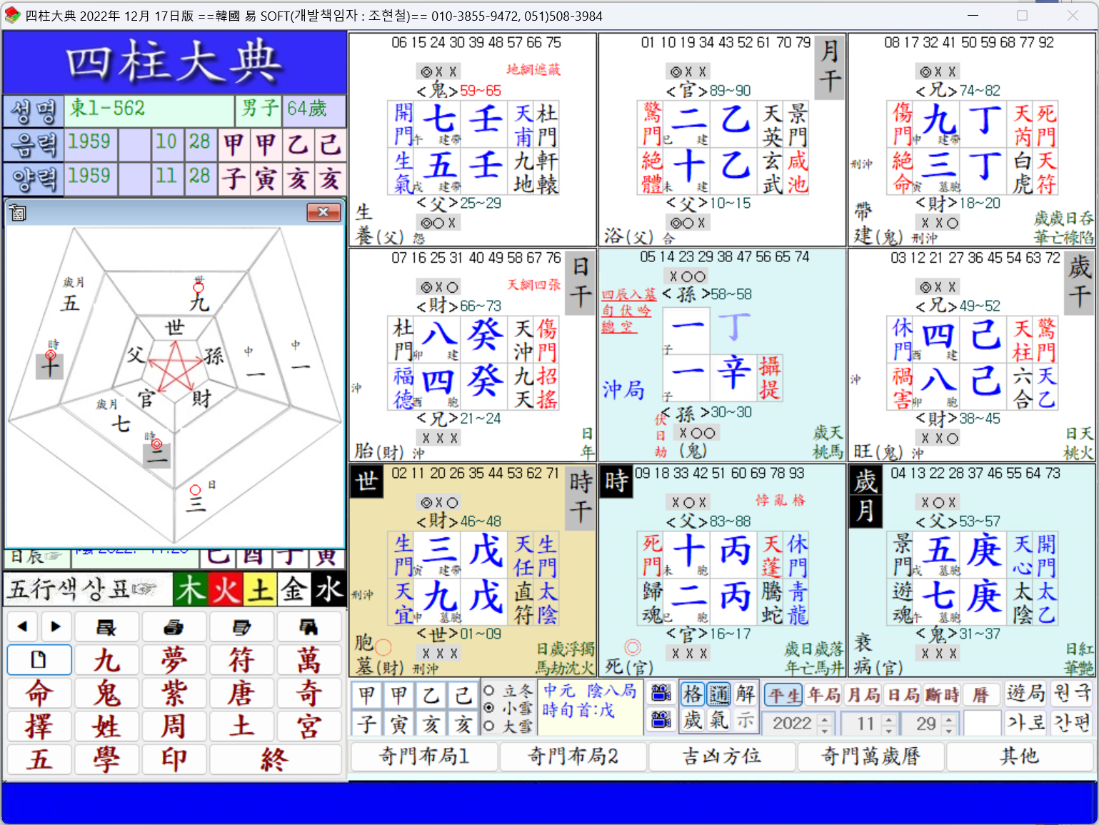 解斷 柱中의 木氣가 金氣와 作沖하여 木氣가 沖剋을 受하고 日干이 落在天網四張인데 網高八尺이요 歲月上 七火가 上數五土와 會合하여 다시 日支九金과 三殺을 作하여 日支 上數木을 沖剋하므로 精神疾患이라 하겠다.