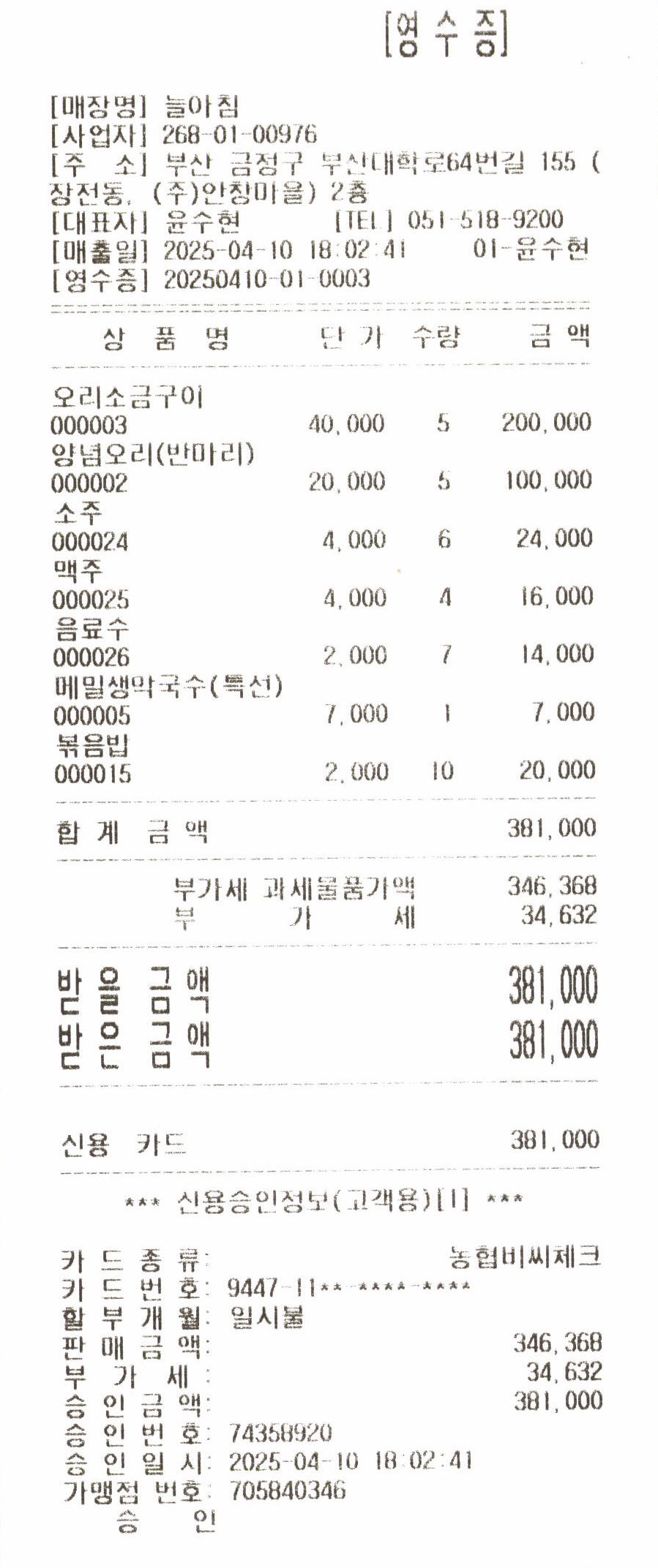 지출: 식사비(늘오늘(오리전문식당) 381,000원/