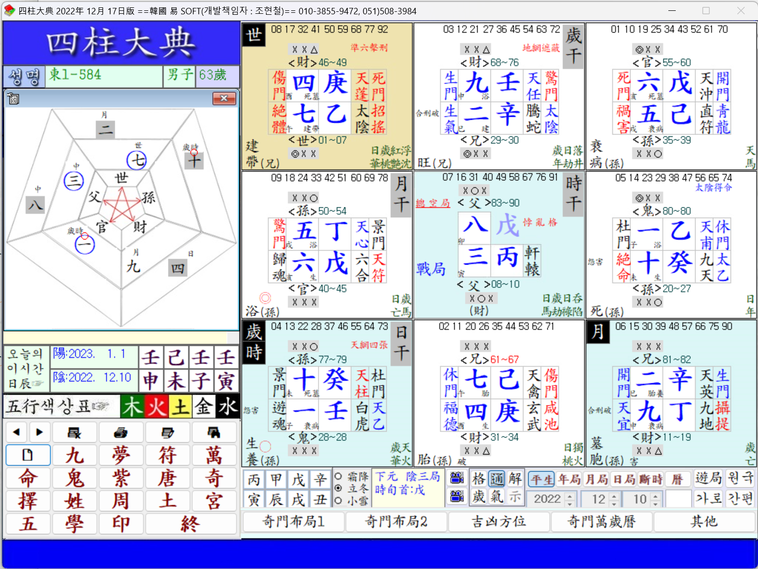 歲上의 天柱白虎에 日上엔 天蓬太陰이라 旗幟槍剣이 마치 昇天旭日之勢인데 月支 開門天宜의 九金偏財가 上數二火와 더불어 中宮 印綬를 寅巳申三刑으로 刑剋하니 逆臣亂賊으로의 豹變은 於此可知事다.