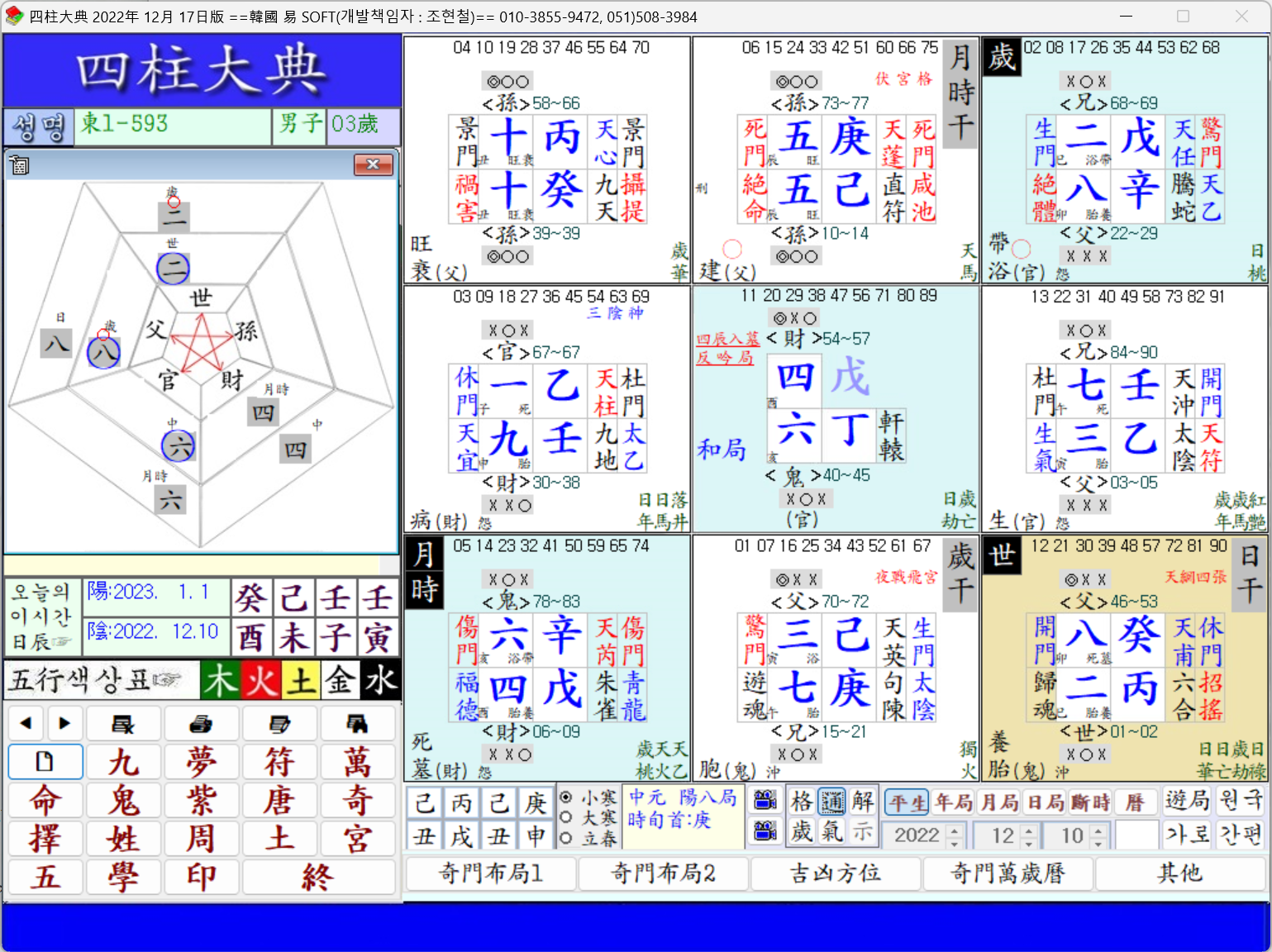 解斷 中生歲하고 歲生日하니 奇門成局인데 太歲가 落空이라 作事는 無成이라 하겠다.