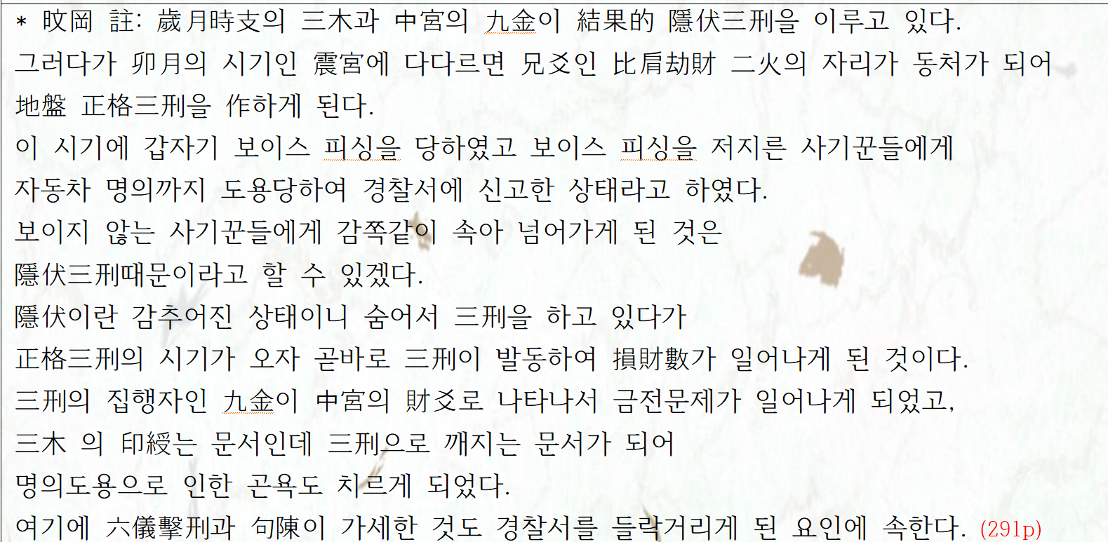 감명실례/삼형살(종합해단) 布局 24. 보이스피싱을 당한 삼형살의 연운 한국기문둔갑학술연구원 2023. 4. 26. 15:05 出處 : 奇門遁甲의 모든 것 綜合解斷과 三刑殺(李奇穆 孫惠琳)