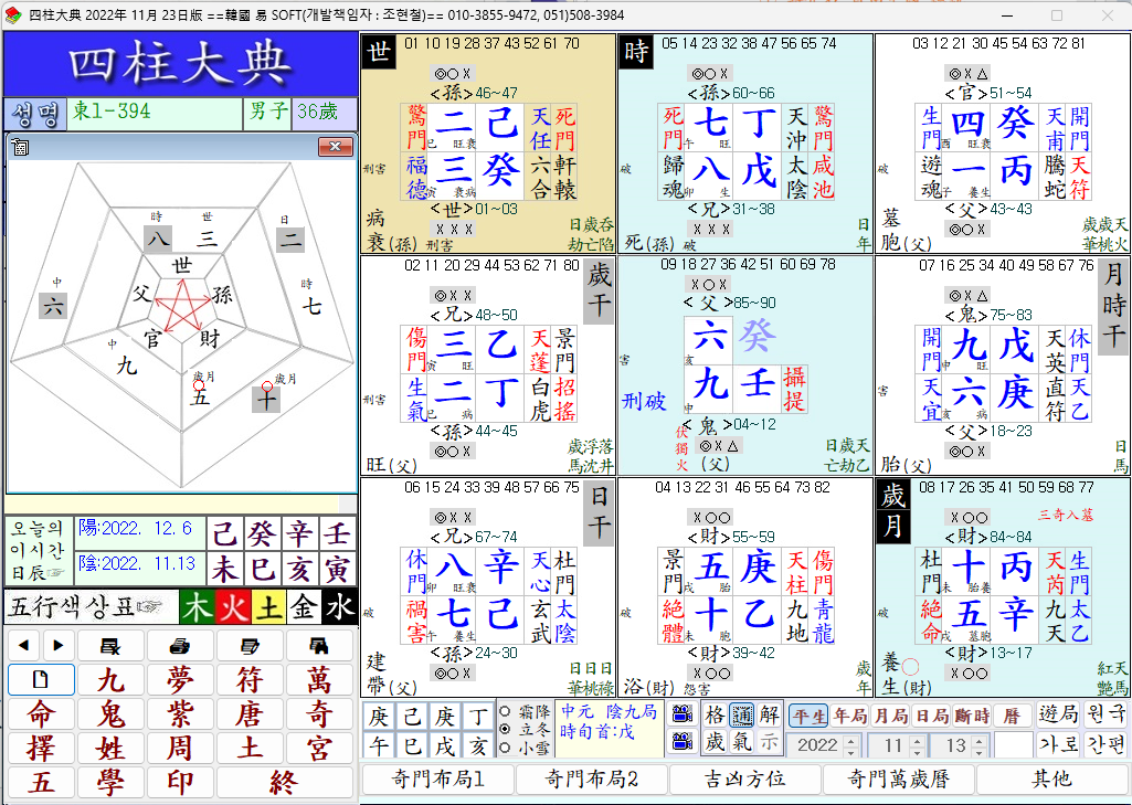 全局의 刑破로서 日支가 寅巳刑이고 歲月이 戌未相刑인데 中宮 九金이 日支三二와 寅巳申三刑을 作하므로 權者의 象徵으로 돋보인다.{395}