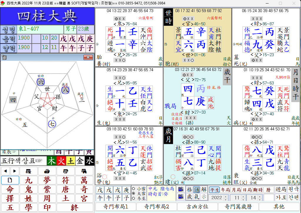 歲月의 雙孫이 中宮 七火를 生하여 三殺로 휘몰아 日時를 助하고 日時가 다시 歲月을 生하므로 四支中宮이 無漏疎通이라 奇局을 形成하고 六水世爻는 火方에 居하므로 頭腦가 明晳하고 柱中 七火가 顯揚하니 心高志大한 相이다.