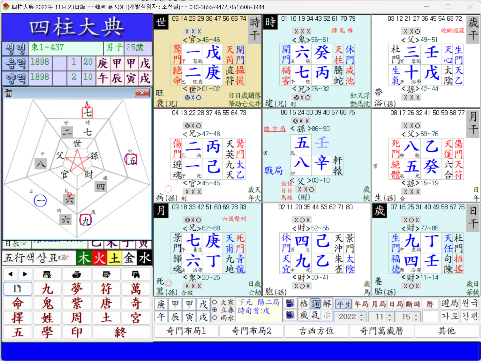 歲上 雙財가 空亡의 月宮을 助起하고 月官이 中印을 通해 殺官生印하니 이른바 通氣라 하고 또 景門 歸魂의 月官上 七火財爻가 中宮 八木上干數인 五土孫爻와 生門 歸魂의 歲支 上干 九金과 五七九 三殺을 作하여 歲上九金이 時上一水 官殺을 生하므로 亦 官星이 有氣하다 하겠다.