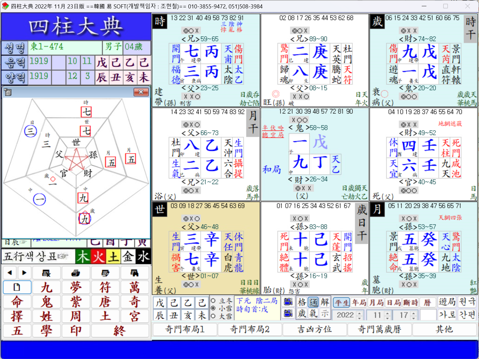 日, 月, 中의 三支가 三殺을 作하고 또 歲月時가 天盤으로 三殺을 作한 가운데 四支가 孟仲季를 고루 갖춰 極權과 貴를 同時에 누릴 相이나 歲上 偏官이 傷官遊魂이고 空亡에 떨어져 마치 如意珠를 놓친 龍과 같은 相이다.