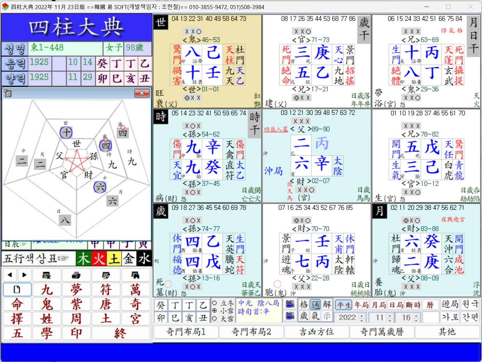女史의 命運이 凶命일 수밖에 없는 또 한 가지 要件은 月支上時干인 六癸가 中宮 日干인 丁奇를 剋하여 五不過時格이 되고 遊年小運의 甲寅이 곧 乾上時干宮이므로 甲寅癸(時干)가 中宮日干丁奇를 처서 非命에 가게 했다.