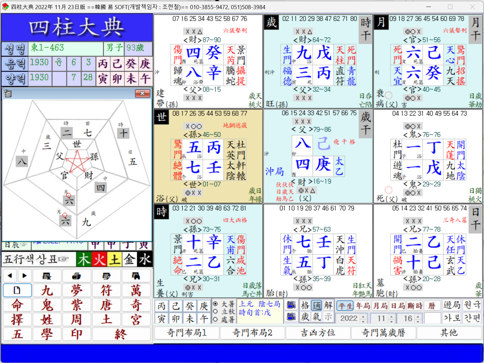 一六水官星의 月支와 兌宮에 各各 兼旺하고 居生인데 日支 上爻의 生助를 받는 中財가 다시 助官을 하므로 官은 旺하지만 兩個官星이 皆落空이니 空亡의 官星이 어떻게 海軍中將까지 올라갈 수가 있겠는가하는 反問과 疑訝心을 가질 수 있겠지만 좀더 仔細히 살펴보면 月上의 旺官이 비록 水空은 流라 하지만 隣近한 歲支의 印綬를 通해 官印相生하므로 官爵을 이룰 수가 있고 더구나 歲支上에 生門福德인데 甲加丙이라 有門有奇에 君臣會座之相인 故로 大吉格이다.{464}