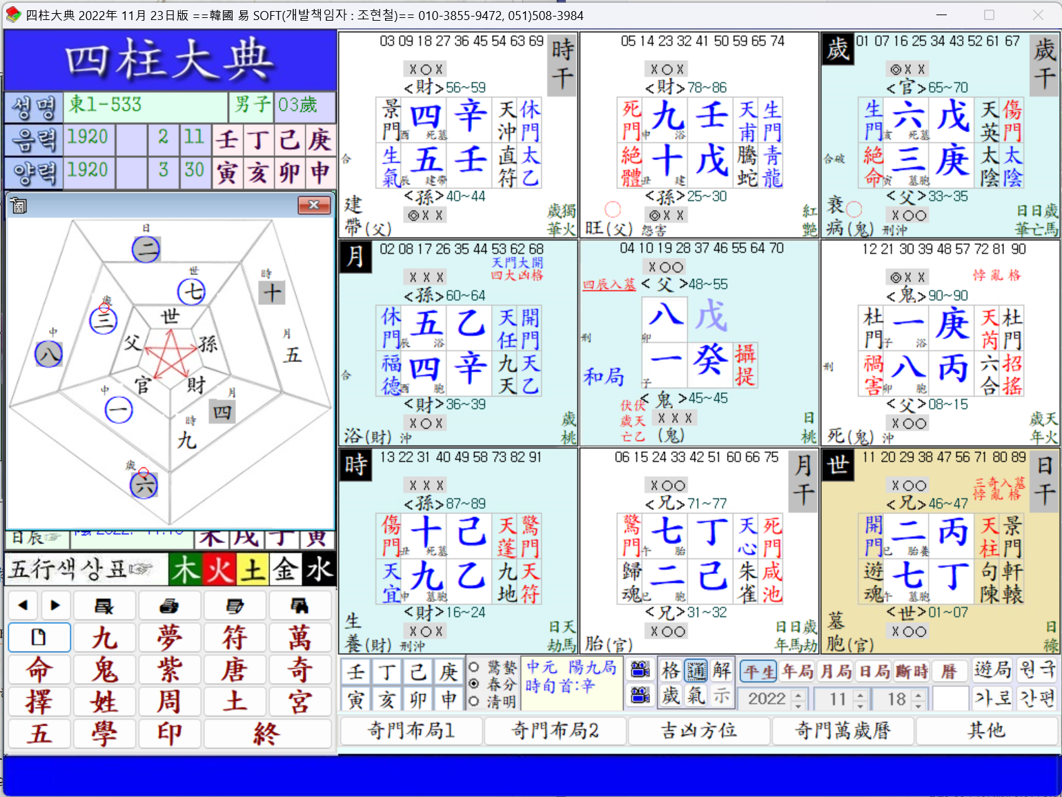 四支가 俱得吉門卦하여 化殺이고 月時財도 食神生財하여 財生官 官生印으로 돌아가므로 亦 財閥形의 典型을 이루기에 足하다.