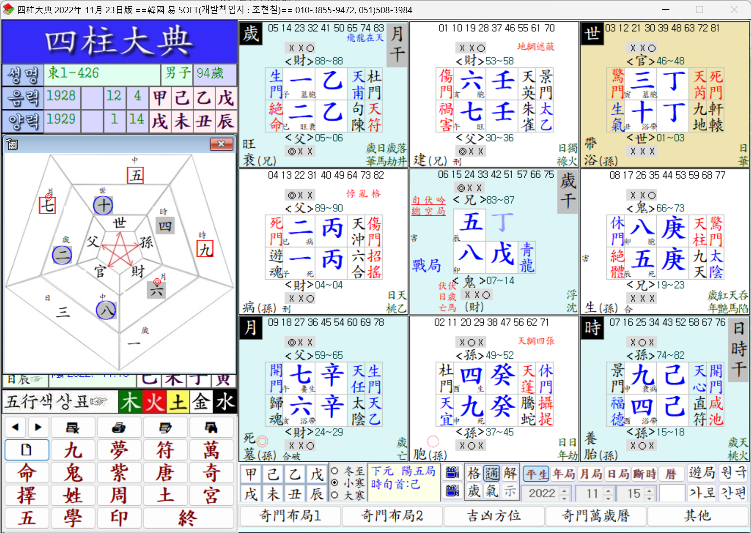 氏의 遊年이 五十九歲에서 六十五歲까지가 月支上의 開門方의 七火 印綬宮에 떨어져 中鬼와 官印相生하여 大志를 遂行하기엔 適格일 듯하나 此遊年宮이 곧 總空에 들어 徒勞無功之數에 그칠 憂慮가 있으니 모처럼 만난 乾坤一擲의 好機마져도 물거품이 될 公算이 크다 하겠다.{428}