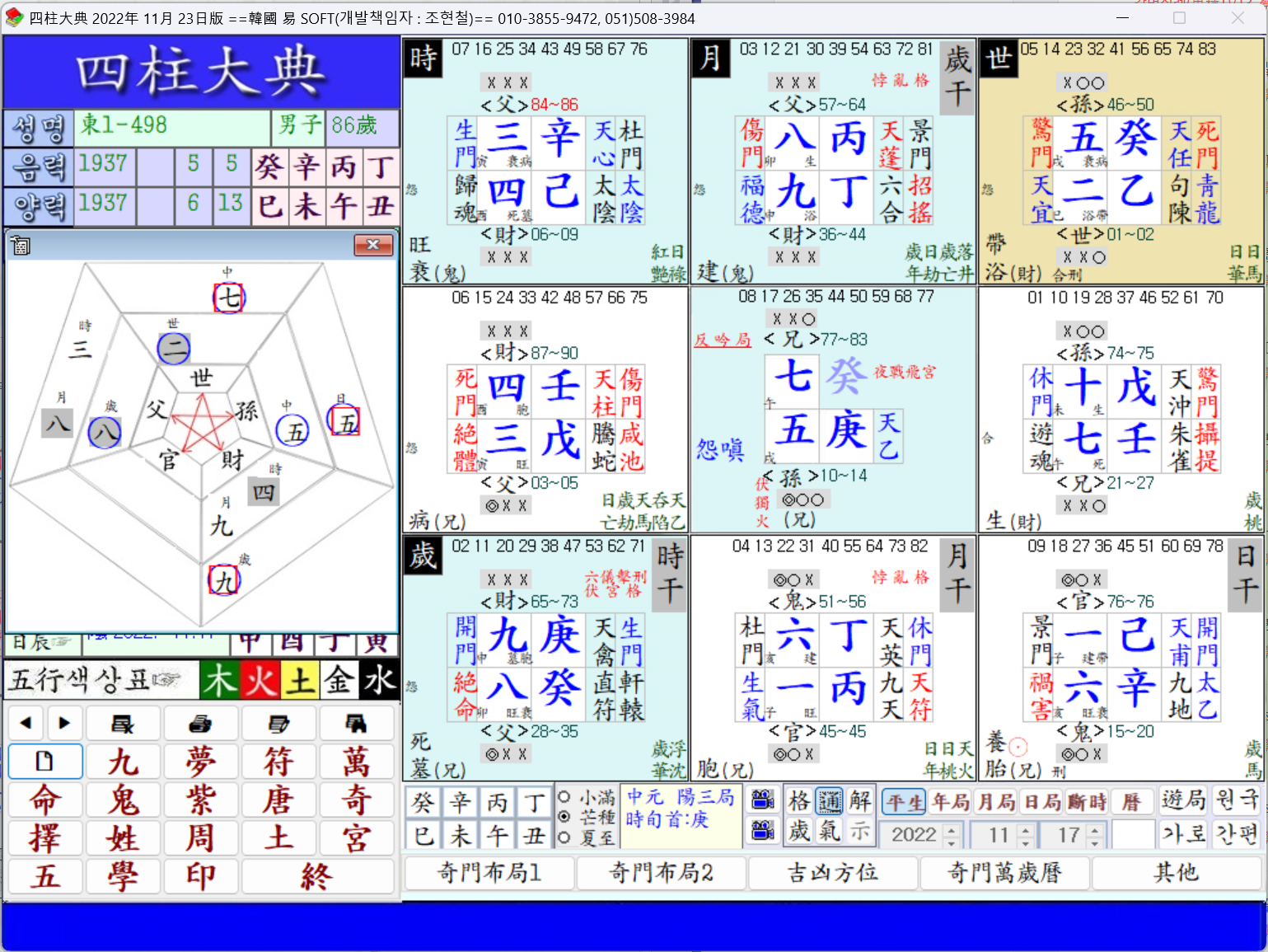 歲支의 印綬가 開門에 乙奇를 逢하고 大格인데 中宮傷官이 乾上雙官에 落在한 日干宮을 剋하니 亦治鬼者로서의 要件을 갖춘 동시에 學者로서의 三要도 갖춘 格이다.