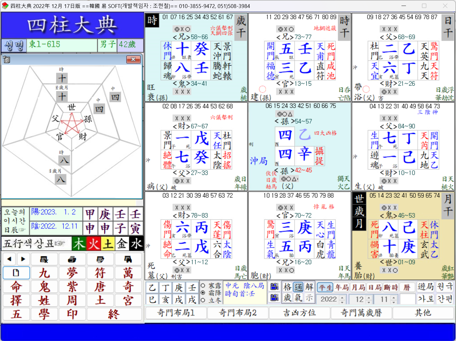 解斷 歲月日三支가 同宮하고 中宮에 雙孫이 앉아 空亡의 官爻를 剋하므로 赴任한지 불과 석 달도 채 못 되어 陰曆 十一月二十七에 突然한 交通事故를 當해 一年間의 長期鬪病生活을 하느라 애쓰다가 恢復後에는 他地方으로 轉出을 갔다.