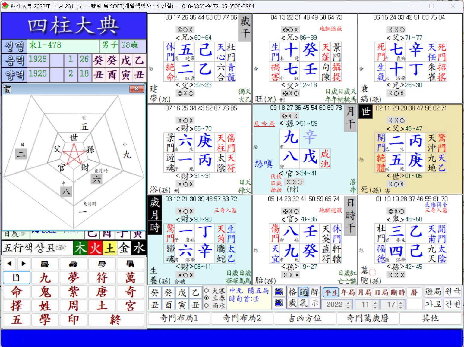 歲生中官인데 外形上 落職이 될 까닭이 없어 뵈지만 그 決定的 要因은 驚門歸魂의 凶門卦와 天地干儀의 凶意에 있다.