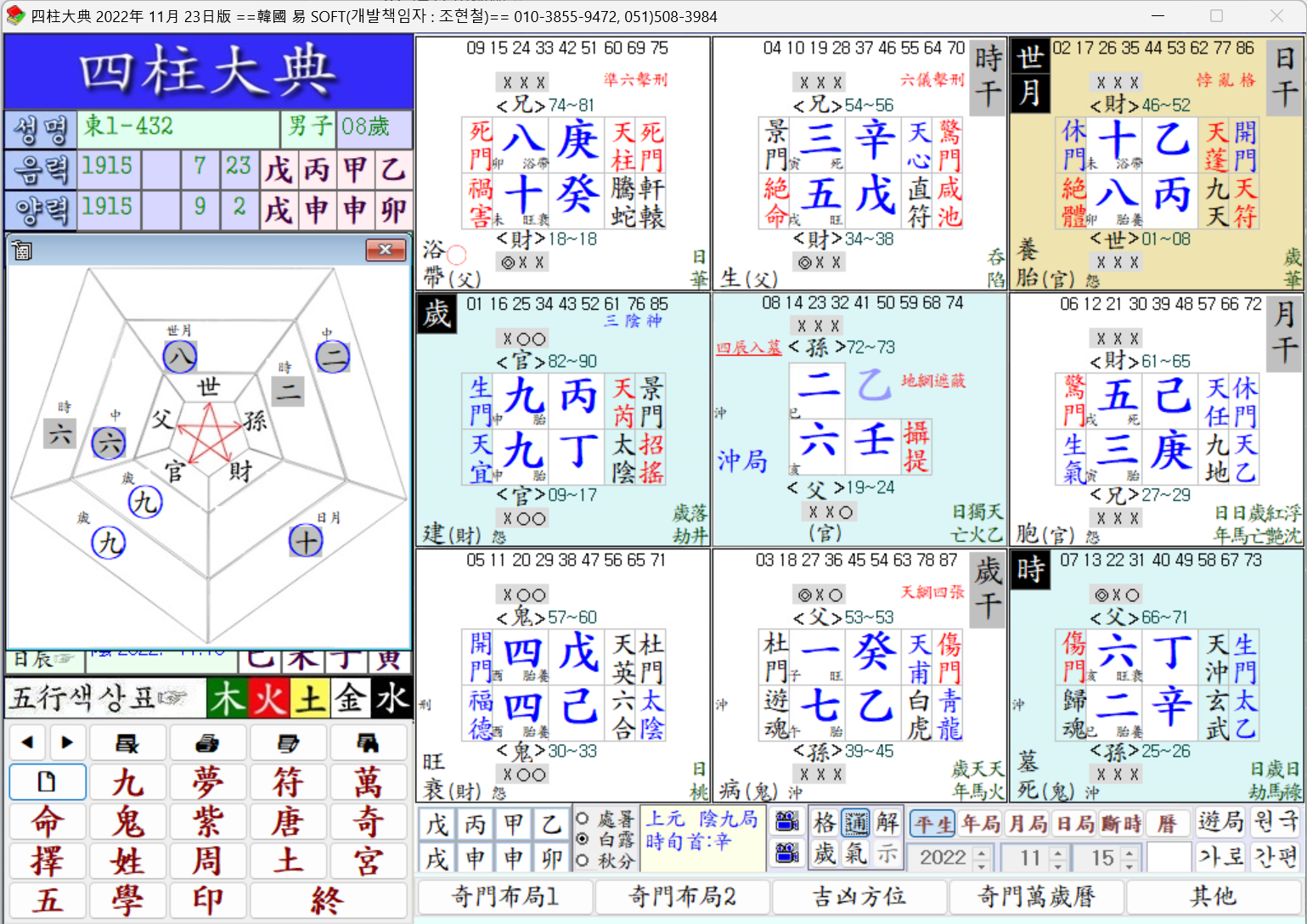 遊年 七十二歲에서 七十三歲는 中宮偏印上의 二火食上이라 이는 挑戰과 試練을 겪어야 할 時期로서 우선 孫動則剋官임은 六親通變의 常識인데 如此한 常識線에서 問題를 한번 살펴본다면 時上에서는 二火食傷이 水地에 앉아 上數의 印爻에 沖剋을 受하니 力不足으로 勢力을 扶植시킬 수가 없어 後退를 한 結果가 되었지만 中宮上에서는 完全 逆地思地가 된 셈이다.{434}