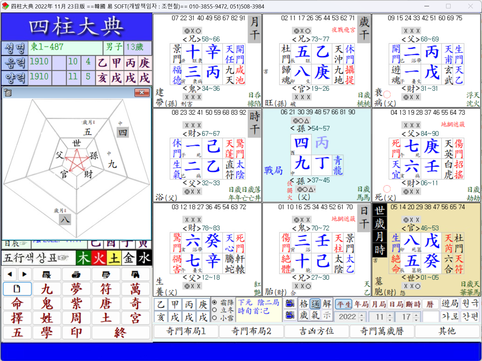 歲, 月, 日, 時 四支가 戌亥乾宮에 會動하여 五土世支는 得令에 失地라 해도 四支重疊이면 그 勢가 莫强하므로 辛旺이라 하겠다.