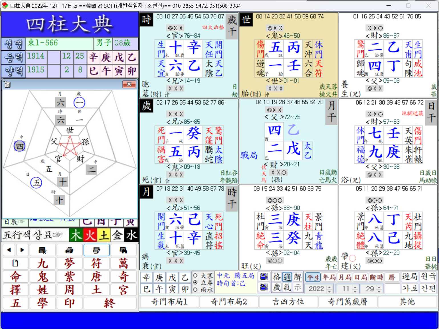 解斷 柱內 二七火氣가 亥子水方에 앉아 中宮의 一水로부터 剋을 受하여 水火相戰으로 發生한 精神疾患의 例가 된다.