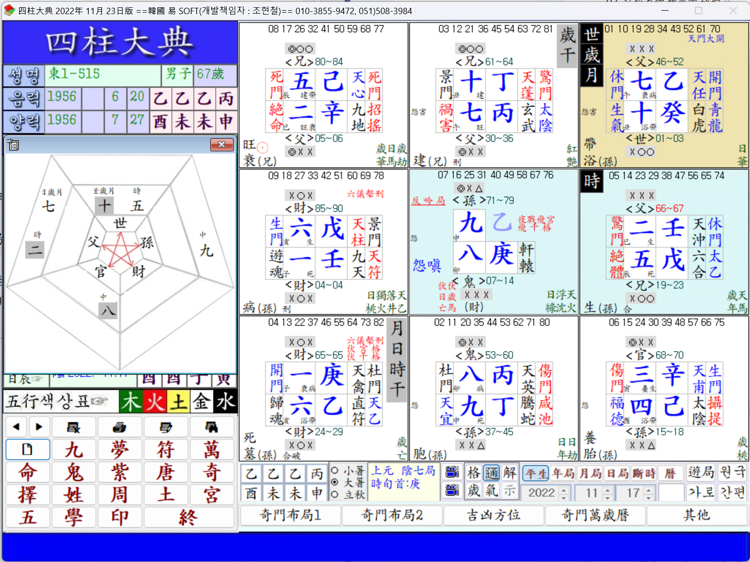日干이 開門歸魂에 天禽直符를 띤 채 落在艮上하여 求道的 生涯가 瀝瀝하고 頭腦 또한 明晳하기 比길데 없다.