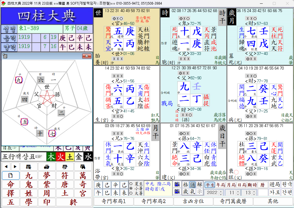 中宮의 二火 財爻는 艮上의 十土偏官과 坤上의 歲月支 四金이 合作 三合하여 全局으로 化變하므로 語學에 卓越한 才能이 認定되며 또한 聲音이 炯亮하다.{390}